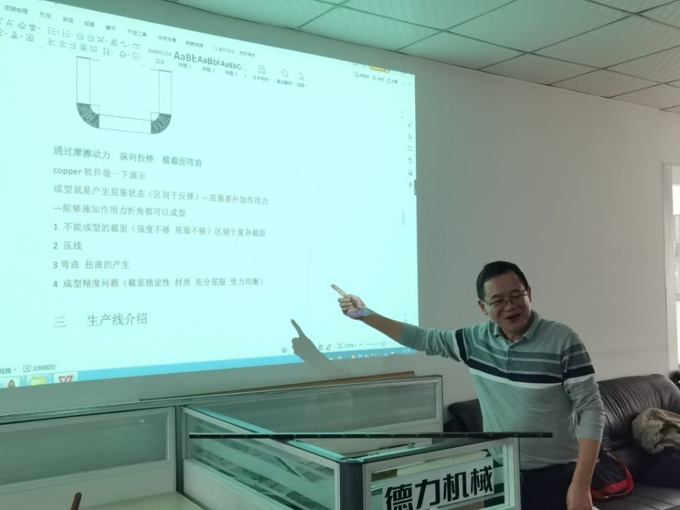 In order to improve the level of business skills and enrich the relevant theoretical knowledge of mechanical equipment, on March 7, Mr. Xie, the chief engineer of Deli, personally conducted a training for the sales team, explaining the roll forming principles in detail.